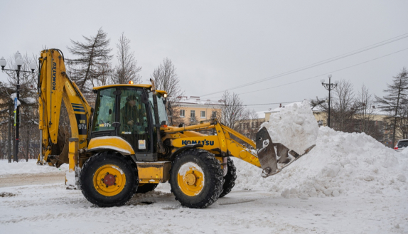 Фронтальные погрузчики и самосвалы грузят и вывозят снег на улицах Лукса, 15а, 17а, Набережной реки Магаданки, 55/4, в переулке Марчеканском, 17.